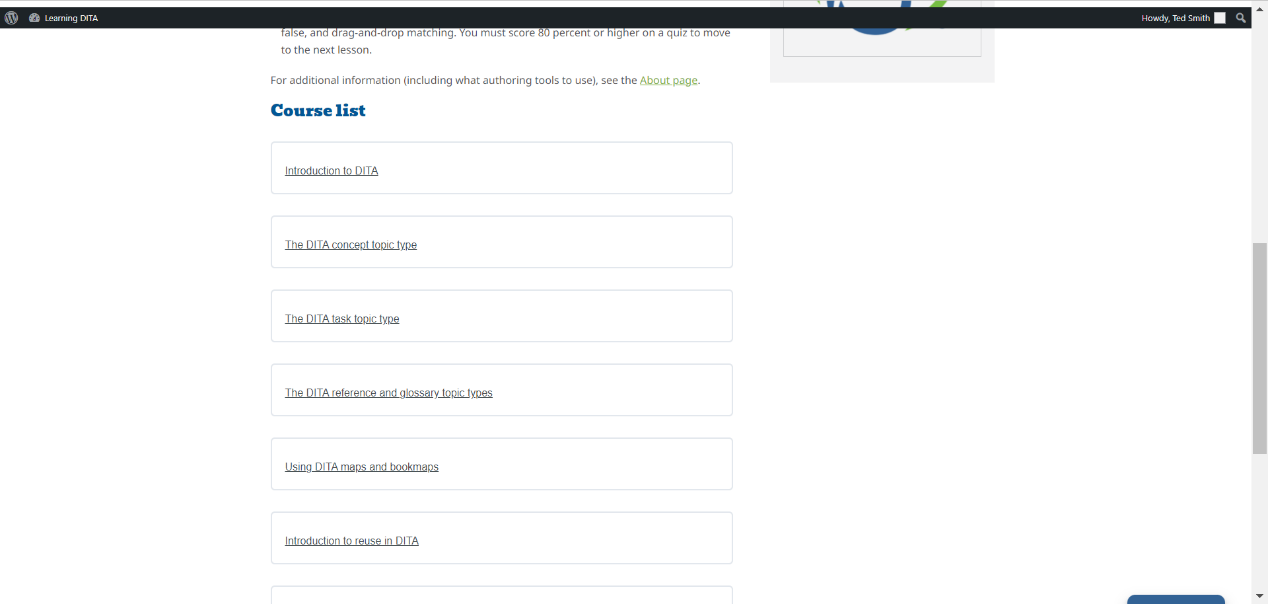 LearningDITA is a site created by Scriptorium as a hub for DITA and content strategy training. It provides free e-learning for individuals who want to explore DITA, the Darwin Information Typing Architecture. This flexible training was designed so you can work through the course content on your own schedule. Lessons include exercises, links to additional resources and videos, and quizzes to test your knowledge.