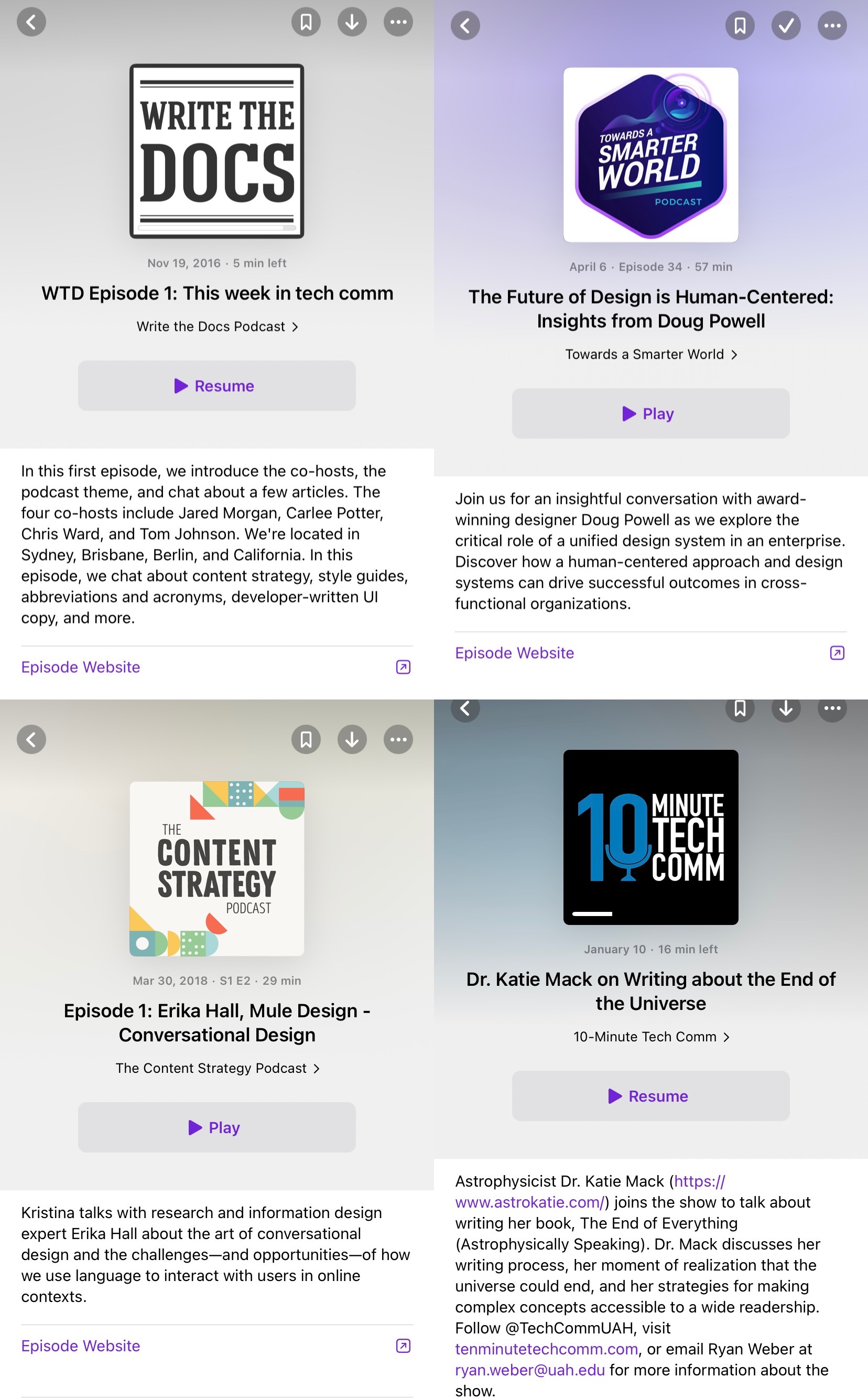 Podcasts are also an important resource that tw beginner or experts resort to for the purpose of generating new ideas, inspiring new ways of technical communication. There are several podcasts available on iphone's Podcast: